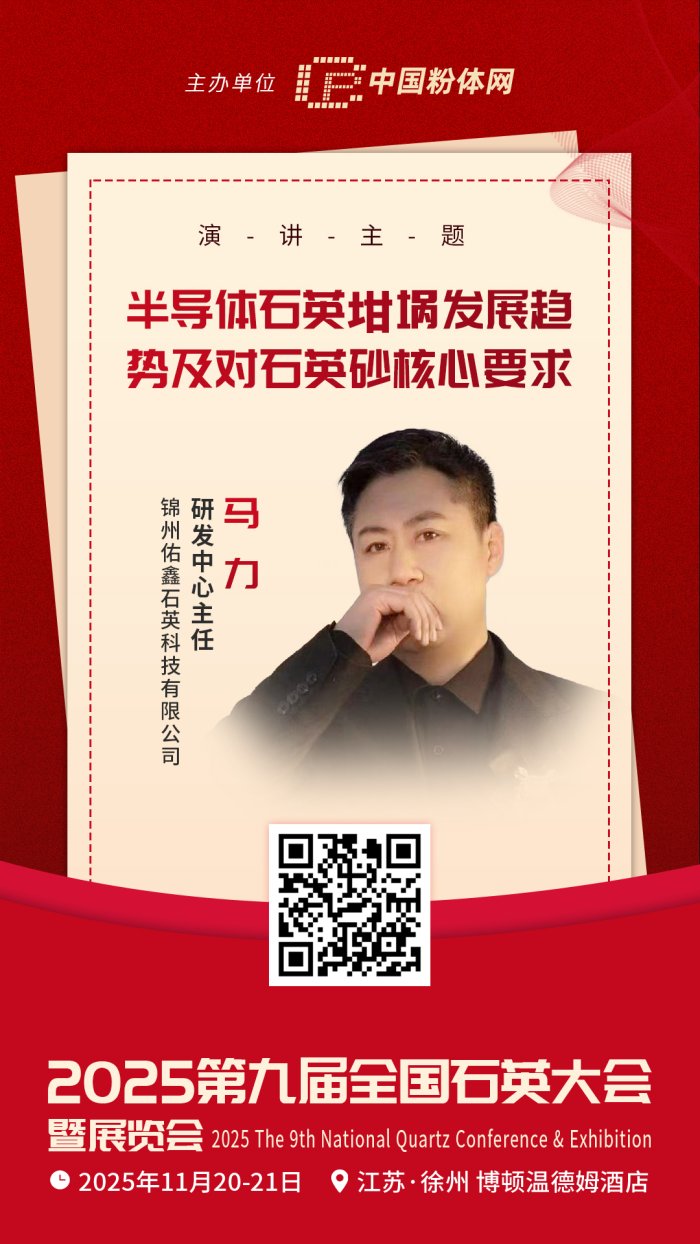 2025年11月20-21日,中國粉體網將在江蘇徐州舉辦“2025(第九屆)全國石英大會暨展覽會”。屆時,錦州佑鑫石英科技有限公司研發中心主任馬力將帶來題為《半導體石英坩堝發展趨勢及對石英砂核心要求》的報告,深入解讀行業關鍵技術與發展方向。