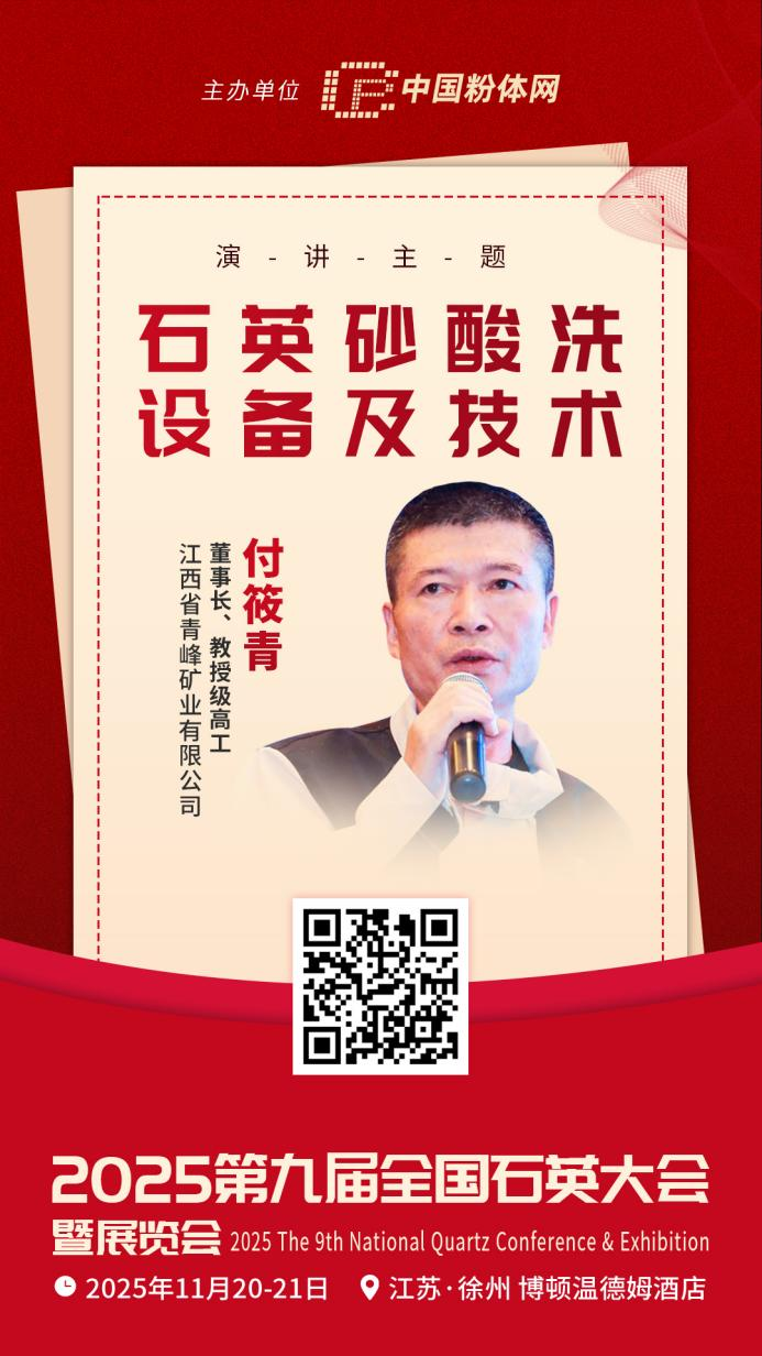 隨著石英行業(yè)的持續(xù)發(fā)展,行業(yè)對酸洗設(shè)備及技術(shù)的關(guān)注度也不斷提升。2025年11月20-21日,中國粉體網(wǎng)將在江蘇徐州舉辦“2025(第九屆)全國石英大會暨展覽會”。屆時,江西省青峰礦業(yè)有限公司董事長、教授級高工付筱青,將帶來題為《石英砂酸洗設(shè)備及技術(shù)》的報告。他將結(jié)合公司實踐經(jīng)驗,深度解讀石英砂酸洗設(shè)備及技術(shù)的核心要點,為行業(yè)同仁提供極具價值的參考。