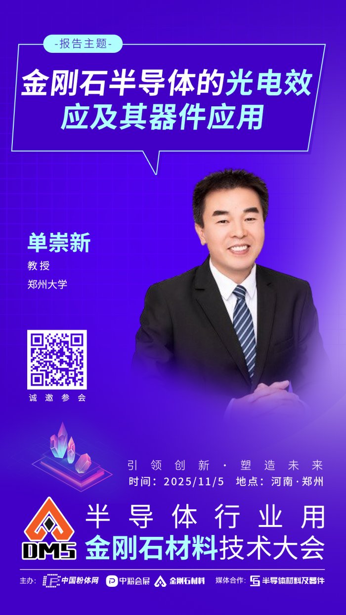 2025年11月5日,中國粉體網將在河南•鄭州舉辦“2025半導體行業用金剛石材料技術大會”。屆時,我們將邀請到鄭州大學單崇新教授出席本次大會并作題為《金剛石半導體的光電效應及其器件應用》的報告。
