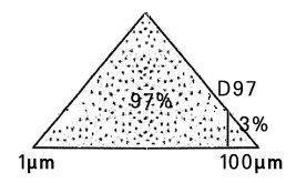 D97是指累積分布百分?jǐn)?shù)達(dá)到97%時(shí)所對(duì)應(yīng)的粒徑值。 就是說粒徑小于 D97 的顆粒占總量的97%,大于D97的占 3%。D97通常被用來表示粉體粗端粒度指標(biāo),是粉體生產(chǎn)和應(yīng)用中評(píng)價(jià)粗端的典型指標(biāo)。有的行業(yè)采用D95、D98來表示粉體粗端粒度指標(biāo)。