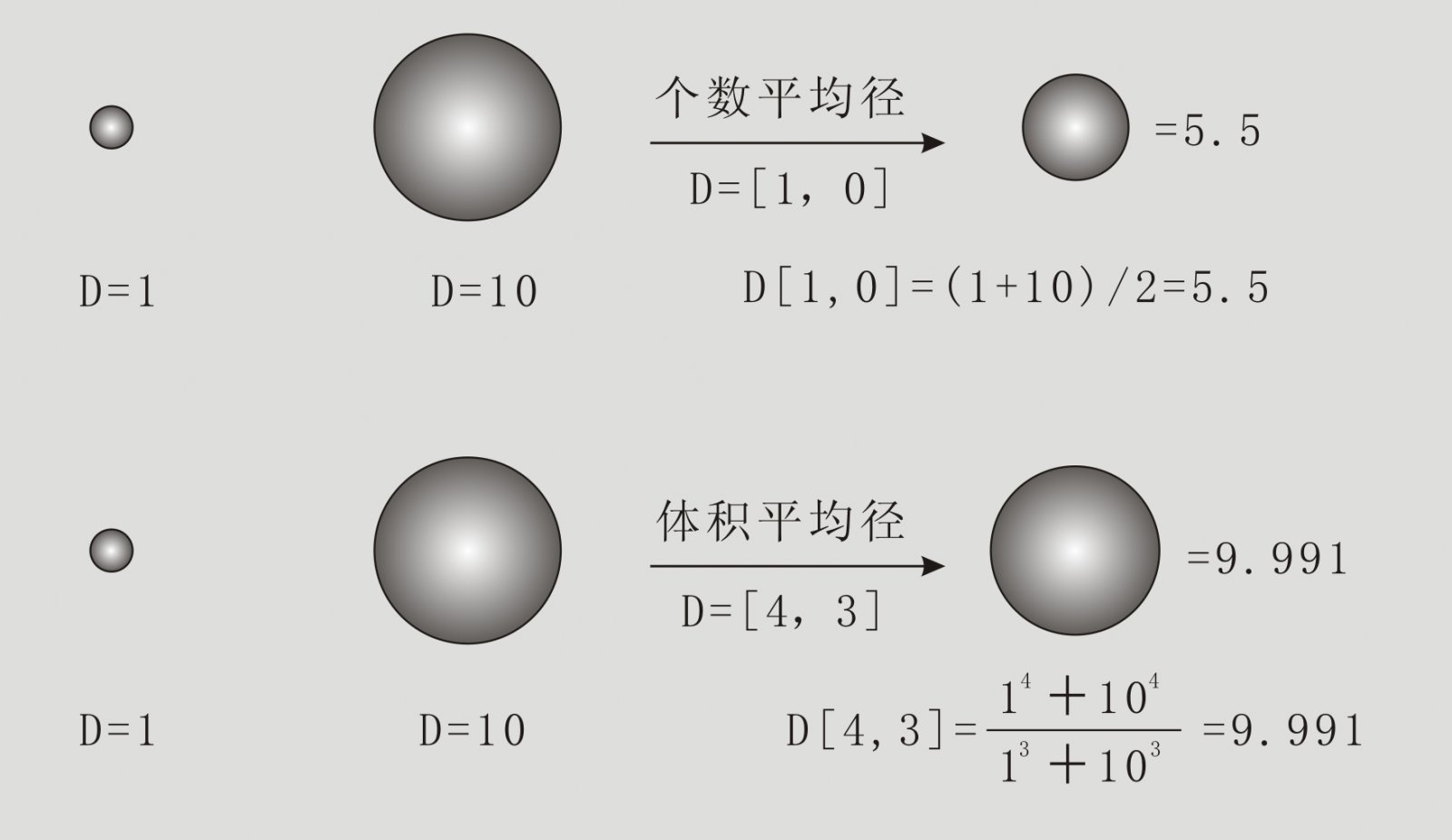 平均徑是表征粉體平均粗細(xì)程度的值,有很多計(jì)算方法,但究竟哪種計(jì)算方法所得到的平均徑更符合實(shí)際呢?舉一個(gè)簡(jiǎn)單的例子,兩個(gè)直徑分別為 1 和 10 的球體,如果你僅對(duì)數(shù)量感興趣,則就簡(jiǎn)單計(jì)算數(shù)量平均直徑,得到的結(jié)果是D[1,0]=(1+10)/2=5.5。但是如果你感興趣的是它的體積,而體積是直徑的三次函數(shù),這樣,直徑為 1的球體體積為 1,直徑為 10 的球體體積為 1000。也就是說(shuō),大球體占總體積的 99.9%,這時(shí)用 D[4,3]能更好地反映顆粒的體積平均徑: