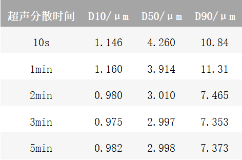 隨著超聲波分散的進(jìn)行粒度逐漸變小,說明樣品有團(tuán)聚現(xiàn)象。當(dāng)分散時間達(dá)到2分鐘后粒度不變了,表明在2分鐘后樣品達(dá)到穩(wěn)定分散狀態(tài)。