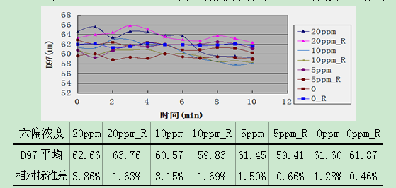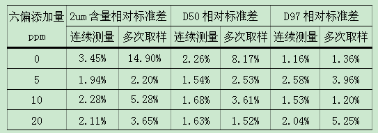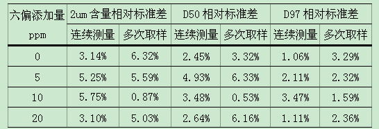 表1:SFC-105B進樣器,加入不同量六偏磷酸鈉D10、D50、D97測量相對均方差
