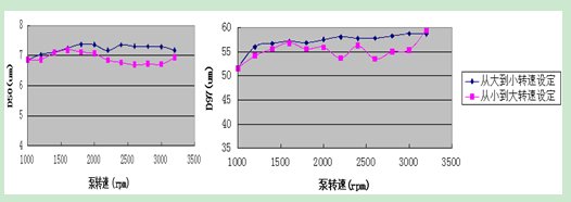 在加入10ppm六偏,加樣超聲2min后,分別設定進樣器離心泵轉速從3200rpm逐次下降至1000rpm后,再逐次升高離心泵轉速至3200rpm,將兩段所得到的D97,D50參數進行趨勢分析。