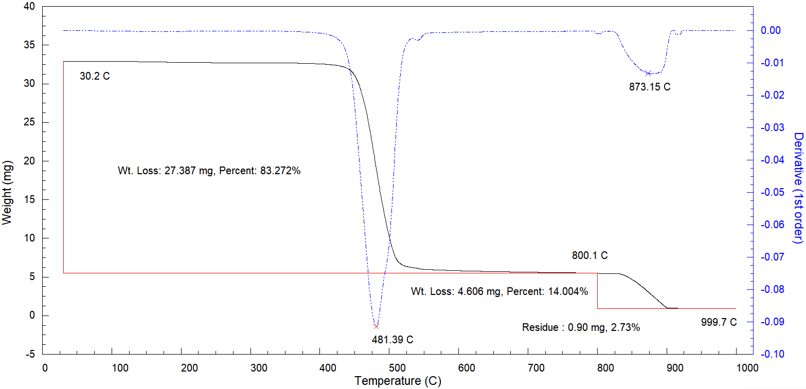 采用精微高博儀器有限公司的TGA1000熱重分析儀分別對(duì)FKM和FFKM兩種橡膠材料進(jìn)行熱重測試。FKM的實(shí)驗(yàn)結(jié)果見下圖2所示。氟橡膠FKM的TGA和DTG曲線顯示,樣品經(jīng)歷了兩個(gè)熱解階段。第一個(gè)臺(tái)階表明聚合物熱解的溫度,大概在250℃左右開始,在約501℃產(chǎn)生DTG峰的主臺(tái)階,且在DTG圖600℃左右產(chǎn)生一個(gè)小臺(tái)階;800℃以后,從氮?dú)馇袚Q到空氣,TGA曲線顯現(xiàn)出第二個(gè)大臺(tái)階,DTG曲線主峰在830℃左右,說明氟橡膠FKM呈現(xiàn)出碳燃燒現(xiàn)象,表明在熱解中有碳黑生成。其樣品的殘余量是4.56mg,殘余百分比15.09%。