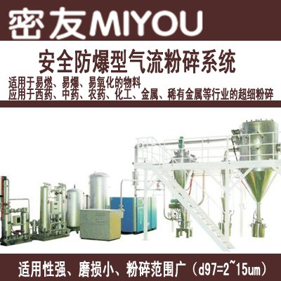 密友安全防爆型氣流粉碎系統采用先進的觸摸屏、可編程PLC控制器,實現了全自動控制。適用于易燃易爆、易氧化的物料,廣泛應用于金屬、西藥、中藥、農藥、化工、化學危險品、易產生靜電物料的超細粉碎。