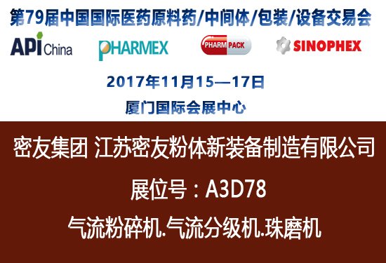 API China2017第79屆中國國際醫藥原料藥中間體包裝設備交易會于今日(11月15日)在美麗的廈門隆重開幕。本屆展會展出面積達到6萬㎡,1000余家原輔料、包裝、設備廠家攜各自最新的產品齊聚廈門。密友集團江蘇密友粉體新裝備制造有限公司如約亮相,只為等待您的到來!