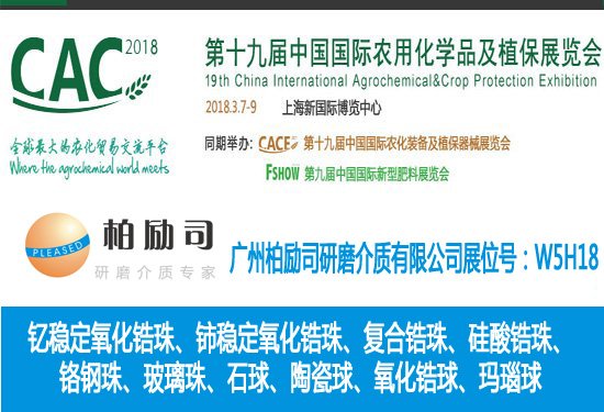 第十九屆中國國際農用化學品及植保展覽會CAC2018將于3月7-9日在上海新國際博覽中心N1-N5及E7館舉辦。據悉,將來自30個國家和地區(qū)的近1400家企業(yè)參展。廣州柏勵司研磨介質有限公司亮相此展,展位號:W5H18,歡迎屆時蒞臨指導!