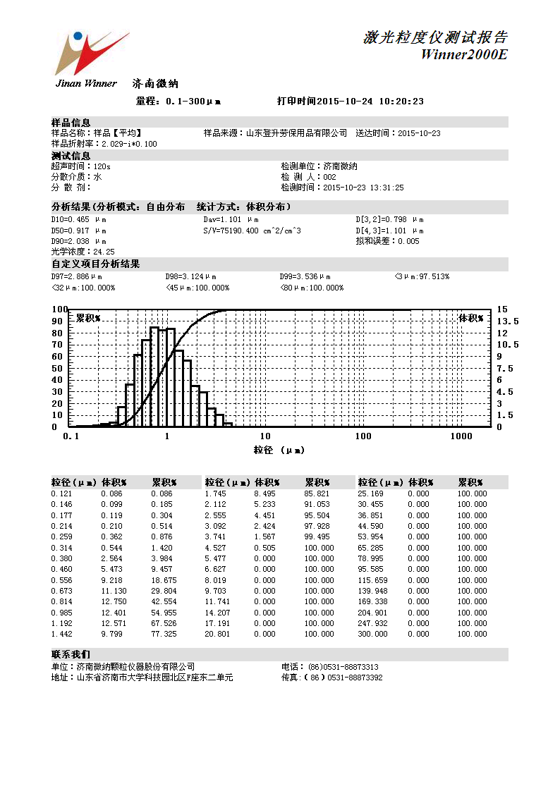 由于顆粒的粒度與形狀對其產品的性質與用途影響很大,不同的測量方法適用于不同的粒度范圍,由于采用了不同的原理,對于同一樣品的檢測結果在數據上會有偏差,目前工廠常用的分析方法已經普遍使用激光粒度儀進行檢測。以下是使用winner2000E檢測的鈦白粉粒度,測試報告如下: