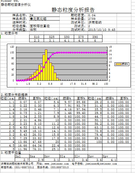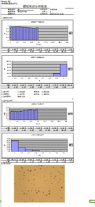 Winner99c是用于顆粒大小分布與顆粒形貌分析的專用儀器。該儀器通過精心設計的光學顯微鏡和專業級的攝像頭獲取顆粒信息;使用計算機圖像分析技術進行分析處理,從而測定顆粒大小分布與顆粒形貌特征。本次實驗使用的Winner 99c靜態顆粒圖像儀,其測試報告如下: