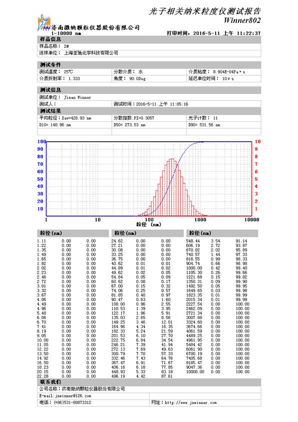 本次試驗使用的winner802基于動態光散射原理的納米激光粒度儀,測試范圍1-10000nm,測試報告如下: