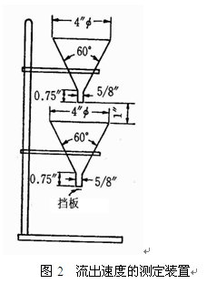 流出速度(flow velocity)是將物料加入于漏斗中測定全部物料流出所需的時間來描述,測定裝置如圖2所示。如果粉體的流動性很差而不能流出時加入100μm的玻璃球助流,測定自由流動所需玻璃球的量(w%),以表示流動性。加入量越多流動性越差。