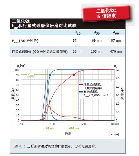 以顏料為例,在顏料的使用過程中,要求其具有微細的粒度和均勻的粒度分布,這就必須對顏料進行研磨分散。使用德國Retsch(萊馳)行星式球磨儀和Emax兩種研磨儀器,對二氧化鈦顏料粉末進行研磨比對(50 ml氧化鋯研磨罐,110g 0.1 mm 直徑研磨球,10g 樣品,15 ml 1%六偏磷酸鈉)。Emax 僅僅用了30 分鐘樣品D90 就達到了87 nm,而行星式球磨儀一共用了90 分鐘( 其中凈研磨時間是30 分鐘) 包括冷卻時間,并且最終出樣細度D90也只有 235 nm. 對比結果Emax 只用了行星式球磨儀三分之一的時間卻完成了其2.7 倍細度。