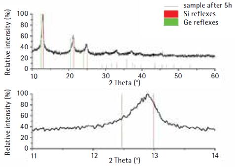 原來硅和鍺的機械合金化反應用是用行星式球磨儀進行的,但是會有很多問題導致結果不盡如人意。行星式球磨儀需要至少80分鐘才能把樣品處理到可以進行機械合金化的初始細度,接下來即使用中低轉速400轉/分也會導致樣品在研磨罐中結塊,無法使用其全部能量來進行機械合金反應。另一個問題是研磨罐過熱需要間歇,在整個13小時的反應時間中需要額外加入至少90分鐘停止時間。而高能球磨儀Emax自帶水冷功能,高速運行也無需間歇,沒有樣品結塊的現象,同時還大大提高了反應效率。