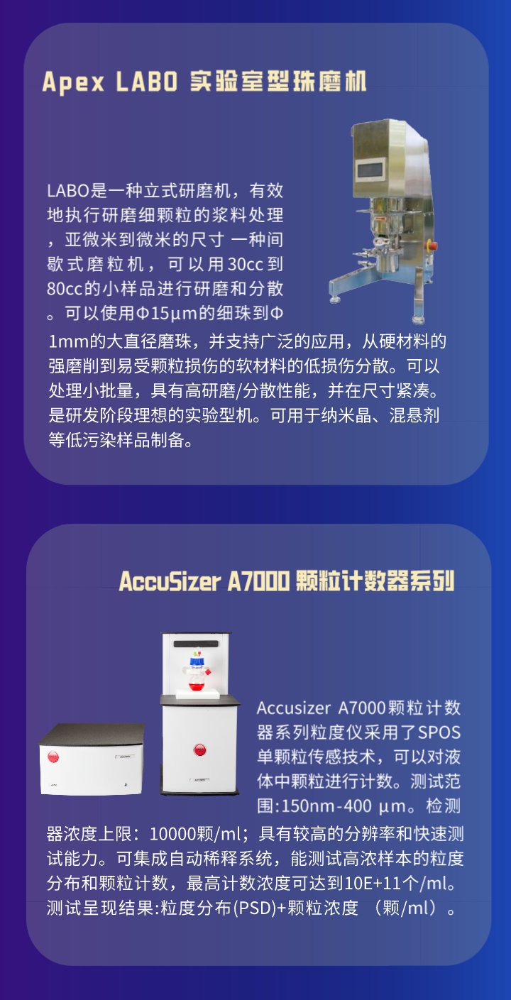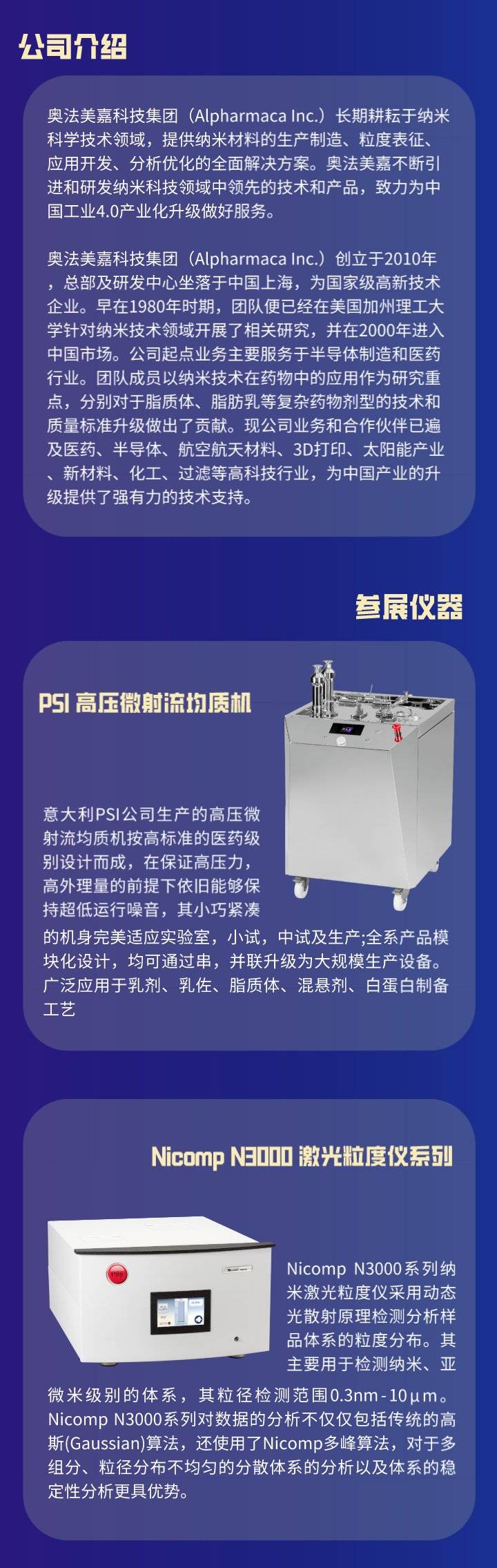 本次展會,奧法美嘉將展示意大利PSI高壓微射流均質機、Nicomp N3000納米激光粒度儀、AccuSizer A7000顆粒計數器、實驗室型珠磨機等產品。