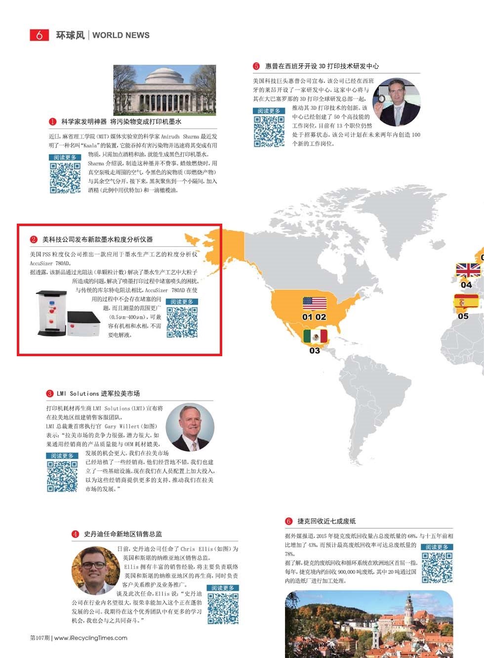由我公司自主研發的基于光阻法單顆粒光學傳感技術SPOS的粒度儀-AccuSizer 780AD,被《再生時代》雜志12月刊-環球風版塊報道。《再生時代》是全球最大的打印耗材展-珠海打印耗材展的官方期刊。