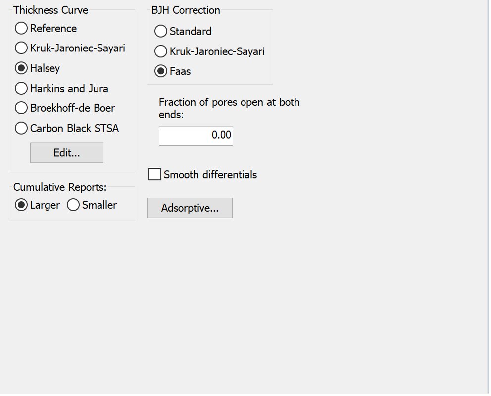 至于 Fass 方法,則適用于對 BJH 計算步驟的修正。簡單來說,BJH 計算步驟涉及到脫附時毛細管中液化吸附質蒸發量和吸附層厚度減少量的分別計算,有時在進行脫附時,介孔中只發生了的吸附層厚度變化,而并沒有發生液化吸附質的氣化,這時就需要引入 Fass 修正。平常來說,大家只要選擇 KJS 修正即可。