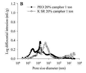 通過壓汞法(AutoPore IV 9500)可以獲得片的內部孔道信息,判斷片的機械強度以及滲透液體的能力。聚合物使得片劑產生彈性行為,比較進、退汞曲線驗證該行為。