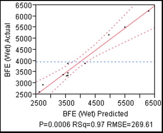 圖一:濕顆粒基本流動能(BFE)的實際與預測值