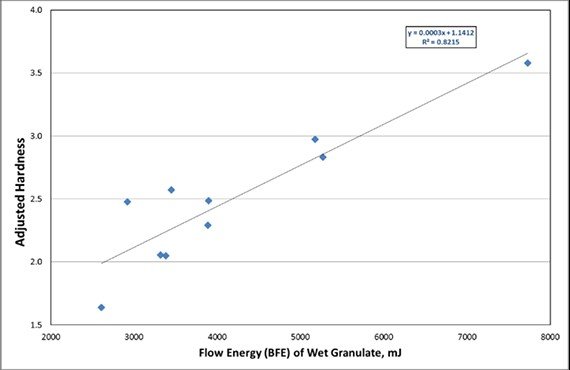 分析壓片數據(圖2)可知,濕顆粒BFE與調節硬度之間存在較強的相關性。因此,結合兩項研究可知如何控制關鍵工藝參數來得到片劑的CQA。