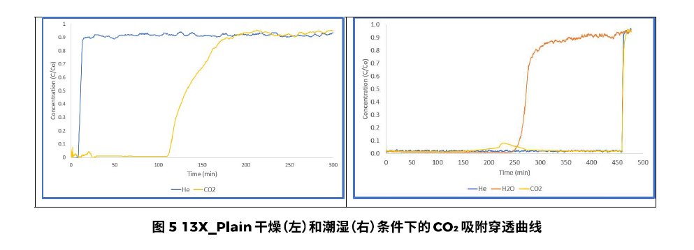 在潮濕和干燥條件下,SiAl_Plain的CO2穿透曲線如圖2所示。左圖中說明CO2的穿透曲線比He標定氣體坡度小,一是因為CO2濃度非常低,二是因為硅鋁(SiAl)顆粒較大導致的一些傳質限制。對比干燥(左)和潮濕(右)兩組結果,我們可以觀察到水的存在導致SiAl_Plain的CO2吸附量顯著下降,這說明CO2和水之間存在競爭吸附。