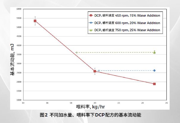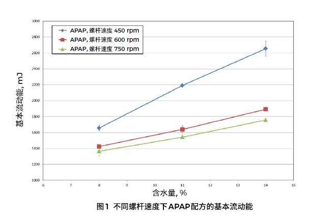 從 APAP 配方的數(shù)據(jù)圖(圖1)可以看出,在固定的給料速度下,對(duì)于所有的螺桿速度,基本流動(dòng)能(BFE)隨著水含量的升高而升高。