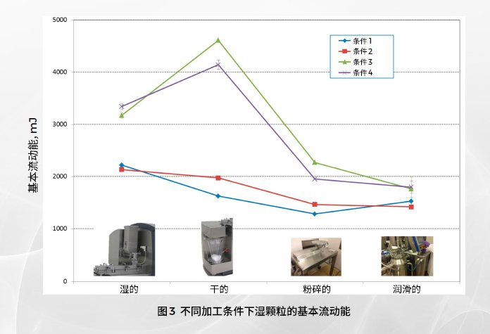 由表 1 所示,選用了幾種不同的加工“條件”組合,造出兩種不同性質(zhì)的濕粒。經(jīng)測(cè)試,在 1&2 條件下,濕粒的 BFE 數(shù)值大概為2200mJ 左右, 3&4 條件下為3200mJ。在整個(gè)濕法造粒加工過程的后續(xù)流程中,BFE 數(shù)值的這一相對(duì)分組情況保持不變,3&4 條件下的 BFE 數(shù)值總是高于 1&2 條件(圖3)。