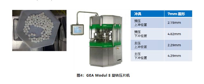 進(jìn)一步使用 GEA Modul S 旋轉(zhuǎn)壓片機(jī)把 4 種不同條件下生產(chǎn)出的經(jīng)濕粒、干燥、磨粉以及潤(rùn)滑后的最終顆粒進(jìn)行壓片,隨后使用 Dr. Schleuniger Pharmatron 8M 壓片硬度測(cè)試儀測(cè)試壓片的強(qiáng)度(見圖 4)。
