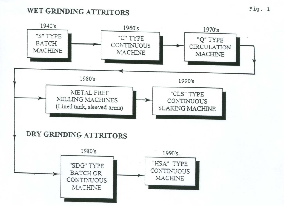 1946 年,Szegvari博士創(chuàng)立了自己的攪拌磨制造公司Union Process Inc.經(jīng)過(guò)近50年(至今已75年)的持續(xù)研發(fā),超細(xì)攪拌磨已成為最高效、用途最廣的研磨和分散設(shè)備之一。圖一顯示了攪拌磨多年來(lái)發(fā)展的概況。