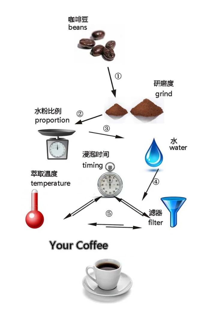 從咖啡豆的挑選,到一杯完美的咖啡,這個(gè)過(guò)程中,需要控制很多因素,包括水溫、研磨度、悶蒸時(shí)間、萃取時(shí)間、咖啡粉和水的比例、水流控制等。