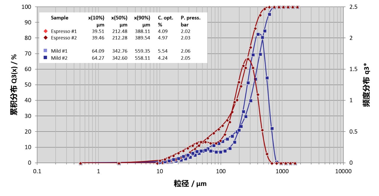 通常,咖啡粉制作的粒度集中在平均粒徑周圍。此外,一定比例的細(xì)粉被認(rèn)為是實(shí)現(xiàn)壓力積聚、醇厚度和美妙油脂所必需。