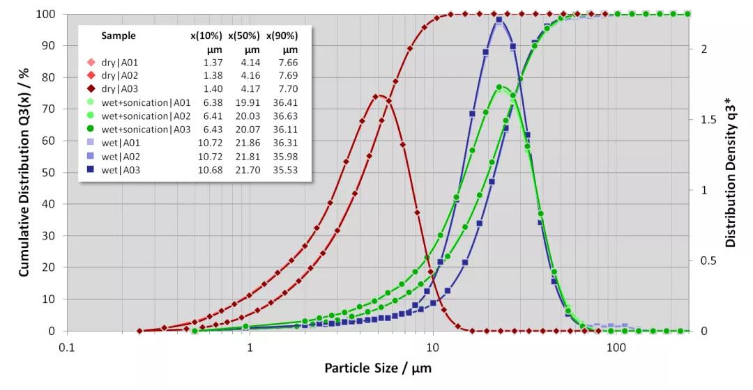 磁材材料因其特殊的性質(zhì),在濕法檢測中,及時使用特殊溶劑、引入超聲能量也很難將其徹底分散。在實際測試過程中,對干法儀器的分散能力要求也非常高:
