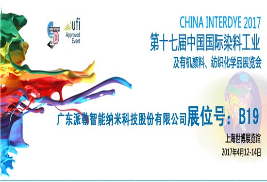 2017第十七屆中國國際染料工業及有機顏料、紡織化學品展覽會(China Interdye 2017)將于2017-4-12在上海世博展覽館隆重舉行。廣東派勒智能納米科技股份有限公司應邀參加,展位號:B19,歡迎屆時蒞臨指導洽談!