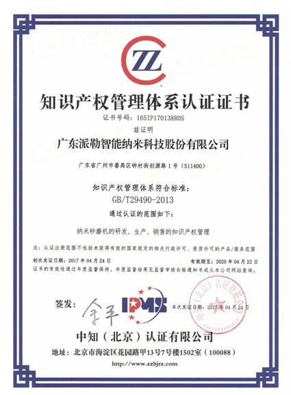 2017年4月24日,根據(jù)中國國家認(rèn)證認(rèn)可監(jiān)督管理委員會(huì)(CNCA)的有關(guān)章程及規(guī)定,中知(北京)認(rèn)證有限公司將《知識產(chǎn)權(quán)管理體系認(rèn)證證書》頒發(fā)給廣東派勒智能納米科技股份有限公司,以肯定及表彰其完整規(guī)范的知識產(chǎn)權(quán)管理流程及卓有成效的實(shí)施成果。認(rèn)證范圍為:納米砂磨機(jī)的研發(fā)、生產(chǎn)、銷售的知識產(chǎn)權(quán)管理。