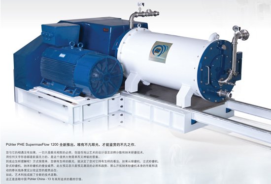 派勒Puhler SuperMaxFlow1200 采用最新研發的整體渦輪式動態轉子功能部件分離物料與研磨珠的設計理念。在全球知名的研磨系統"MoliNex"上做了進一步的優化,是目前工業上應用最廣的一種砂磨機,最大容量可以達到3000 升。