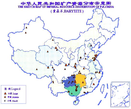 中國重晶石資源豐富,全國26個省,市自治區均有分布,主要集中在南方,貴州省占全國總儲量三分之一,湖南、廣西分別居全國第二、第三位,中國重晶石不但儲量大,而且品位高,BaSO4>92.8%。富礦儲量占全國富礦總量的99.4%,大中型礦儲量占全國總量88.4%。