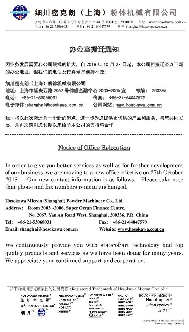 細川密克朗(上海)粉體機械有限公司喜遷新址