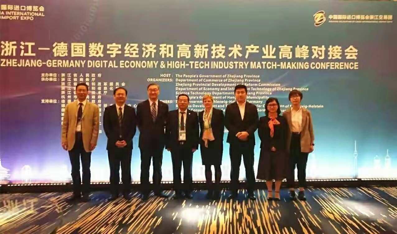 浙江巨化集團董事長沈銘華(左四)、細川阿爾派運營總監Sylvia Braeunlein(右四)、細川密克朗上海董事長內田良範(左三)等雙方代表出席了浙江-德國合作項目簽約儀式