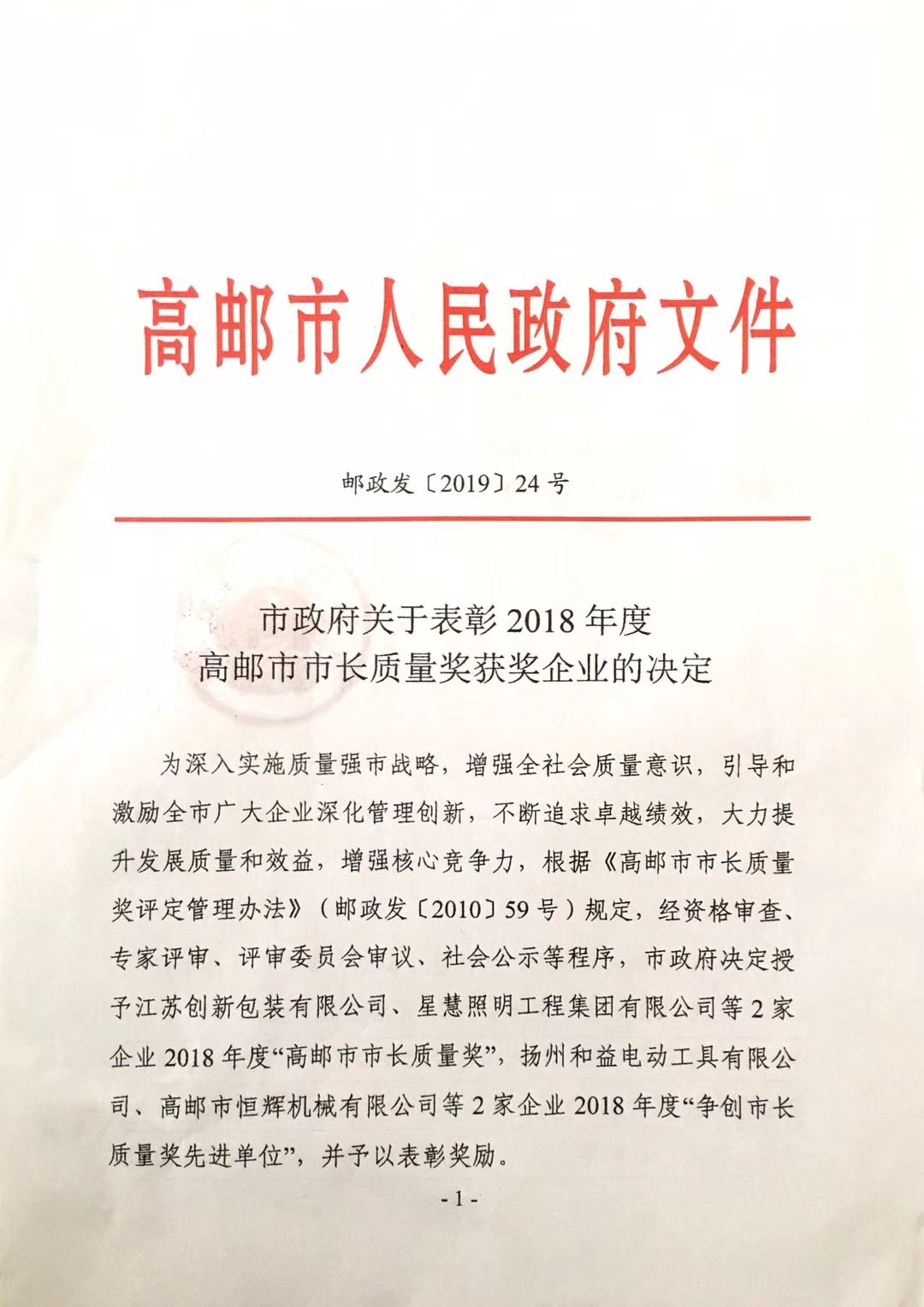 近日,高郵市人民政府發(fā)布了“市政府關(guān)于表彰2018年度高郵市市長質(zhì)量獎獲獎企業(yè)的決定”,的文件。文件中說決定授予江蘇創(chuàng)新包裝有限公司2018年度“高郵市市長質(zhì)量獎”。