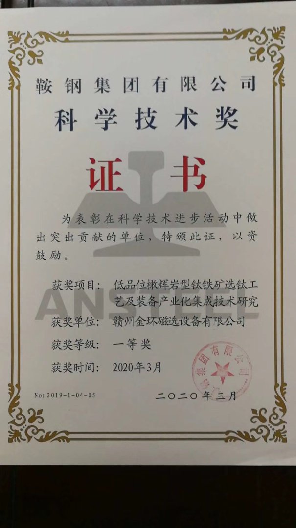 2020年3月,鞍鋼集團(tuán)有限公司頒科學(xué)技術(shù)獎(jiǎng)證書(shū),用于表彰贛州金環(huán)磁選設(shè)備有限公司在科學(xué)技術(shù)進(jìn)步活動(dòng)中做出突出貢獻(xiàn)的單位。