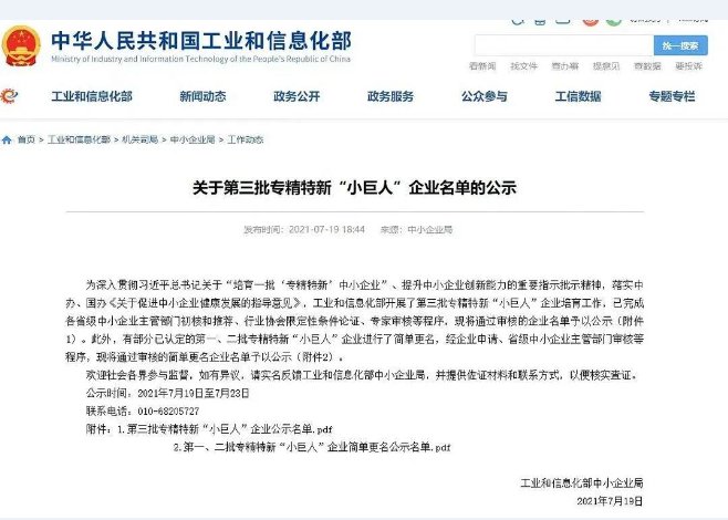 關(guān)于第三批專精特新“小巨人”企業(yè)名單的公示