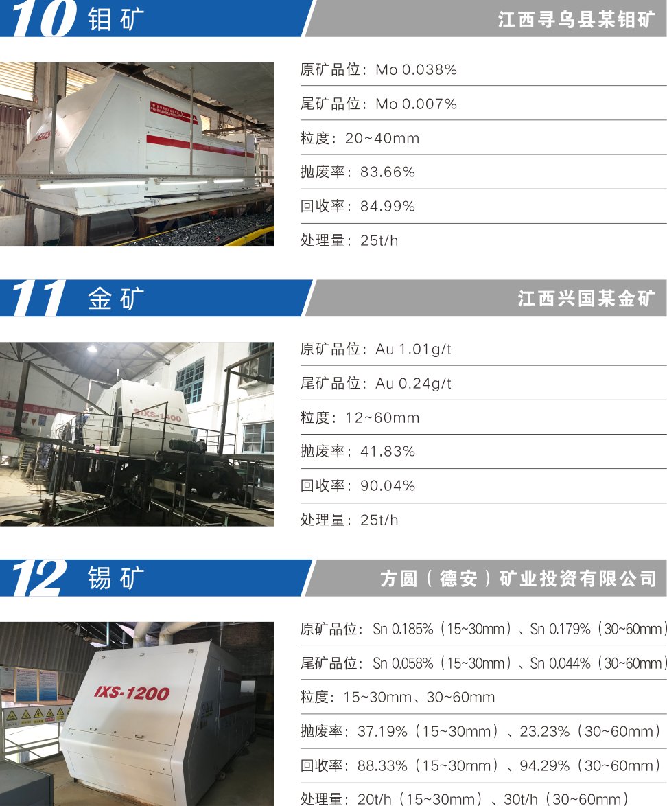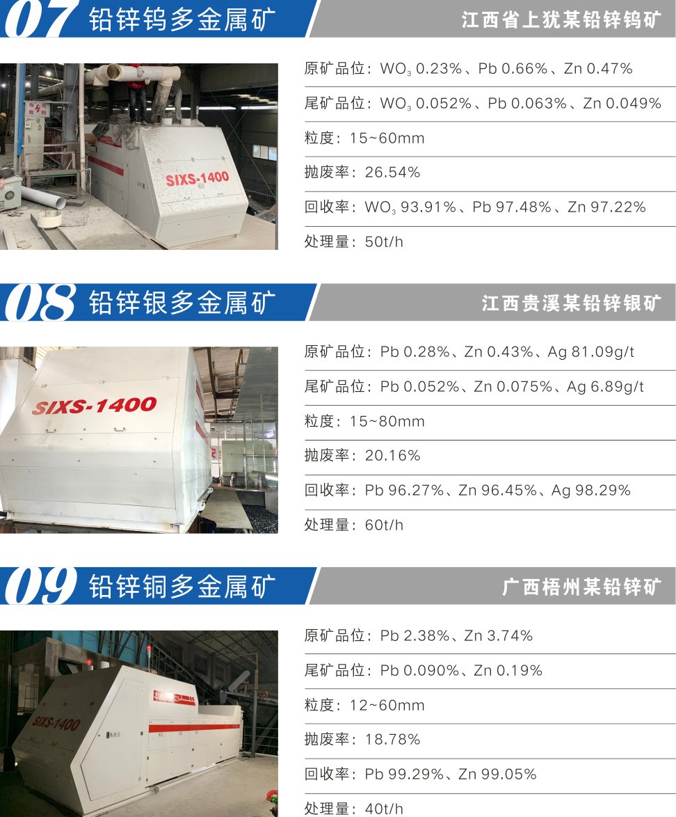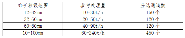 適用于鎢礦、銻礦、錫礦、鉛鋅銀礦、銅礦、金礦、鉬礦等有色金屬、貴金屬、稀有金屬礦以及長石、石英等非金屬的預選拋尾工藝,替代人工手選作業、全磨全選,可大幅提高粗選拋廢率,提高入磨品位,擴大產能,提質增效,降低選礦成本,實現礦山智能化生產。SIXS型裝備可分選10-100mm粒級范圍礦石,最大處理能力達240t/h。主要性能參數見表1。