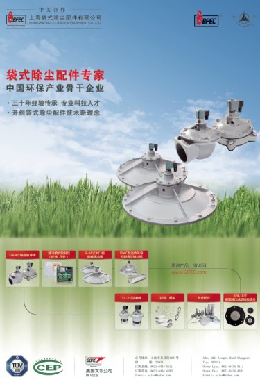 上海袋式除塵配件有限公司是國內生產袋式除塵器配件品種最為齊全、質量最為優異著名企業。30年來,上海袋配生產的袋式除塵產品被運用于世界各地的鋼鐵冶金、水泥、火力發電、化工、建筑,垃圾焚燒等行業中的粉塵治理和煙氣凈化,產品出口到美國、歐洲、日本及東南亞等地區,在國內外市場享有很高的聲譽和知名度。上海袋配產品有電磁脈沖閥、清灰控制儀、濾袋、濾袋框架、專用配件、電氣控制柜及過濾筒等。