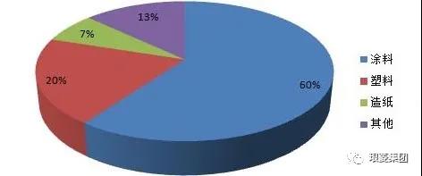 鈦白粉廣泛應(yīng)用于涂料、 塑料、造紙、印刷油墨、化纖、橡膠、化妝品等工業(yè)應(yīng)用領(lǐng)域,其中涂料占60%、塑料占20%、造紙占14%、其它占6%。