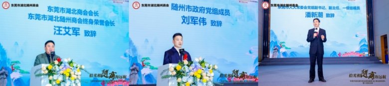 隨州東莞市湖北商會會長、東莞市隨州商會終生榮譽(yù)會長汪艾軍,來自隨州的家鄉(xiāng)領(lǐng)導(dǎo)——隨州市政府黨組成員劉軍偉,東莞市人大常委會黨組副書記、副主任、一級巡視員潘新潮等領(lǐng)導(dǎo)也上臺發(fā)表了致辭。