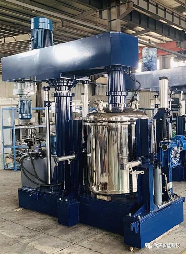 雙行星攪拌機工作過程中,兩支平行的攪拌槳按設定的固定旋轉比例運轉,沿攪拌桶公轉的同時亦快速自轉,同時攪拌桶內有隨公轉同步運轉的回旋刮板不停旋轉,使物料由攪拌桶內壁移動到攪拌槳附近,攪拌器的運轉方向與公轉可同向亦可逆向,達到不同剪切目的。另兩支單獨動力裝置的高速分散齒盤亦隨公轉一起沿攪拌桶內運轉,進行分散,乳化,高速分散齒盤為變頻調速,可根據生產工藝自定轉速。