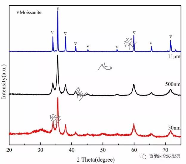 由圖3與圖4可知:物料經過超細研磨后,峰形(半峰寬)變寬,毛刺增多,說明結晶度下降,這是穿晶破碎導致晶面破壞所致。