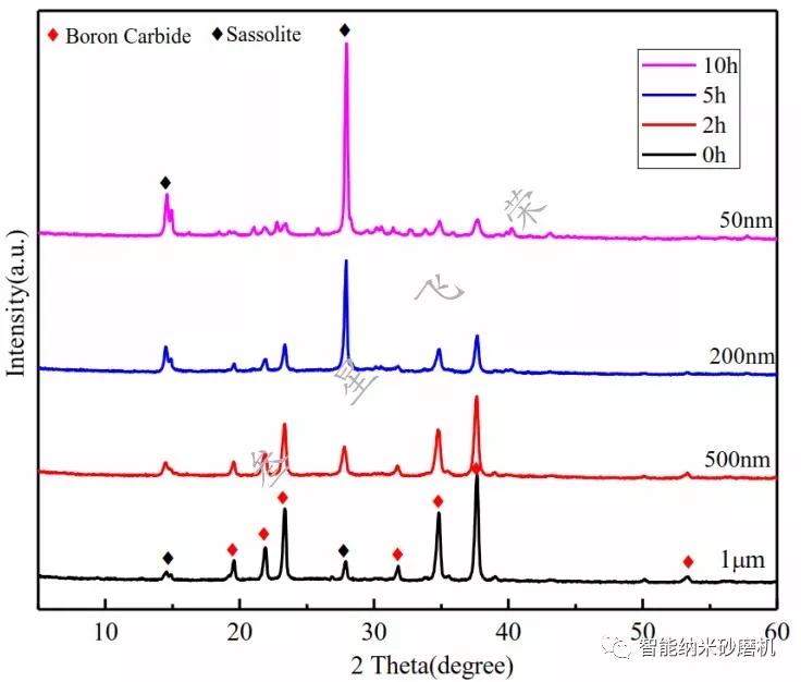 由圖5與圖6可知:研磨時間越長,顆粒越細,碳化硼的特征峰逐漸減弱,硼酸特征峰逐漸增強,說明在水基研磨體系中存在以下反應,而且顆粒越細,活性越強,水解反應越明顯: