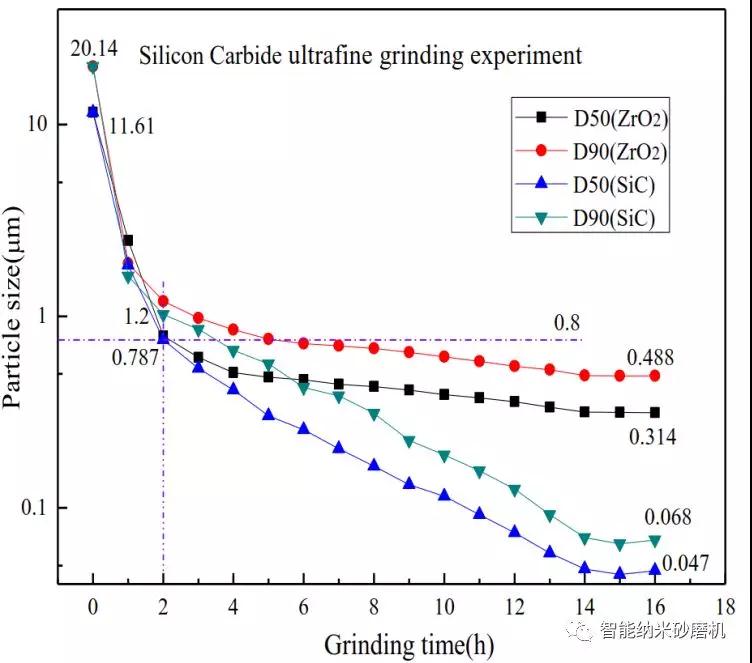 圖1 不同磨介研磨碳化硅的粒度隨時間的分布圖
