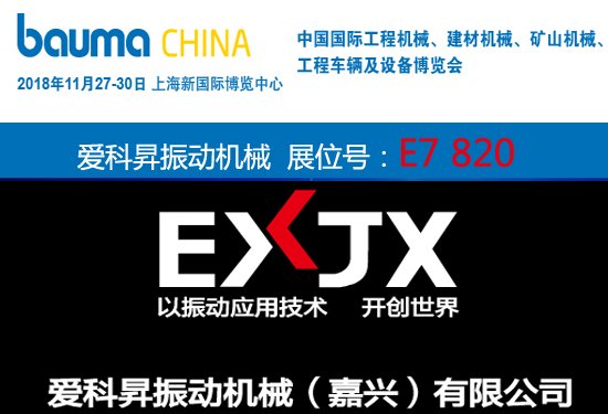 bauma CHINA 2018 將于2018年11月27-30日在上海新國(guó)際博覽中心舉辦。愛科昇振動(dòng)機(jī)械(嘉興)有限公司應(yīng)邀參加,為您提供各種振動(dòng)設(shè)備及解決方案。